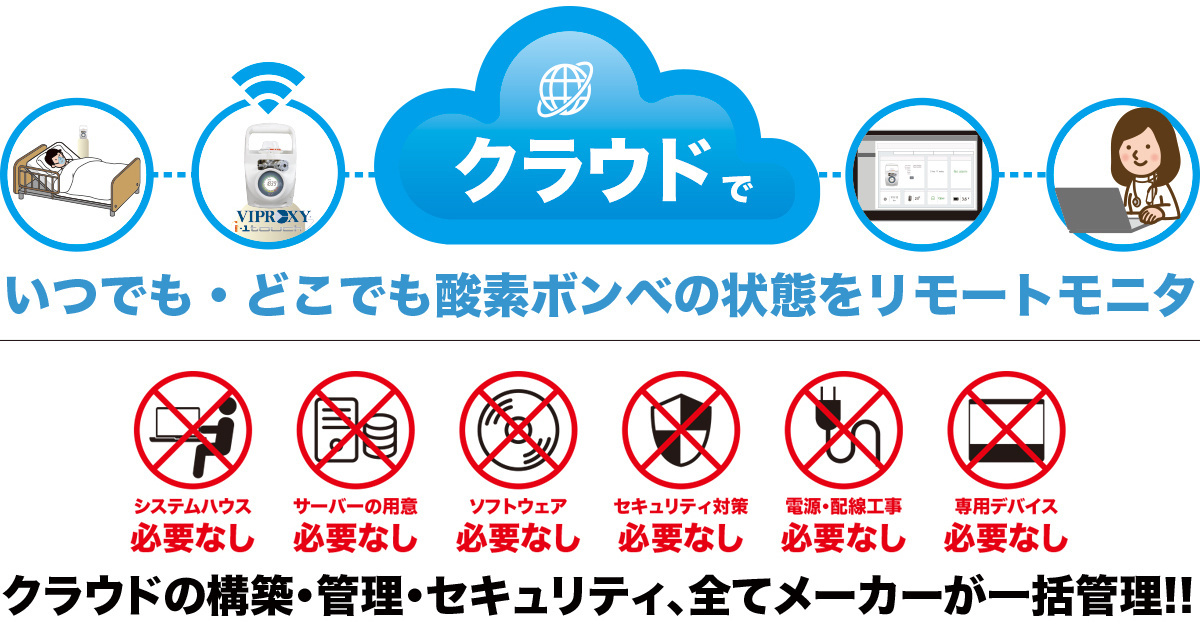 クラウドの設定からサーバー・システム構築・管理・セキュリティ、全てメーカーがご用意するので、外注のシステムハウス等は必要ありません。また、病院のPCにソフトウェアをインストール必要もなく、クライアント様はクラウドにアクセスするだけ。専用のデバイスもいりません。バルブは電池で作動するので配線工事も必要なしです。